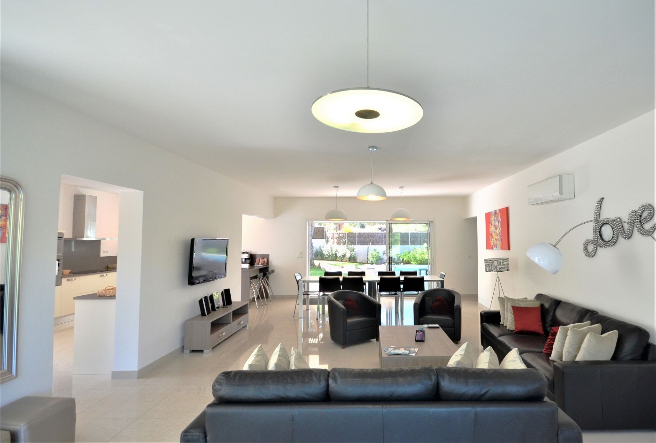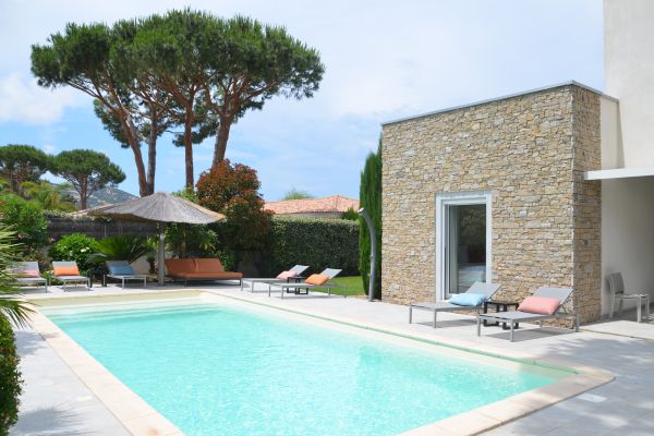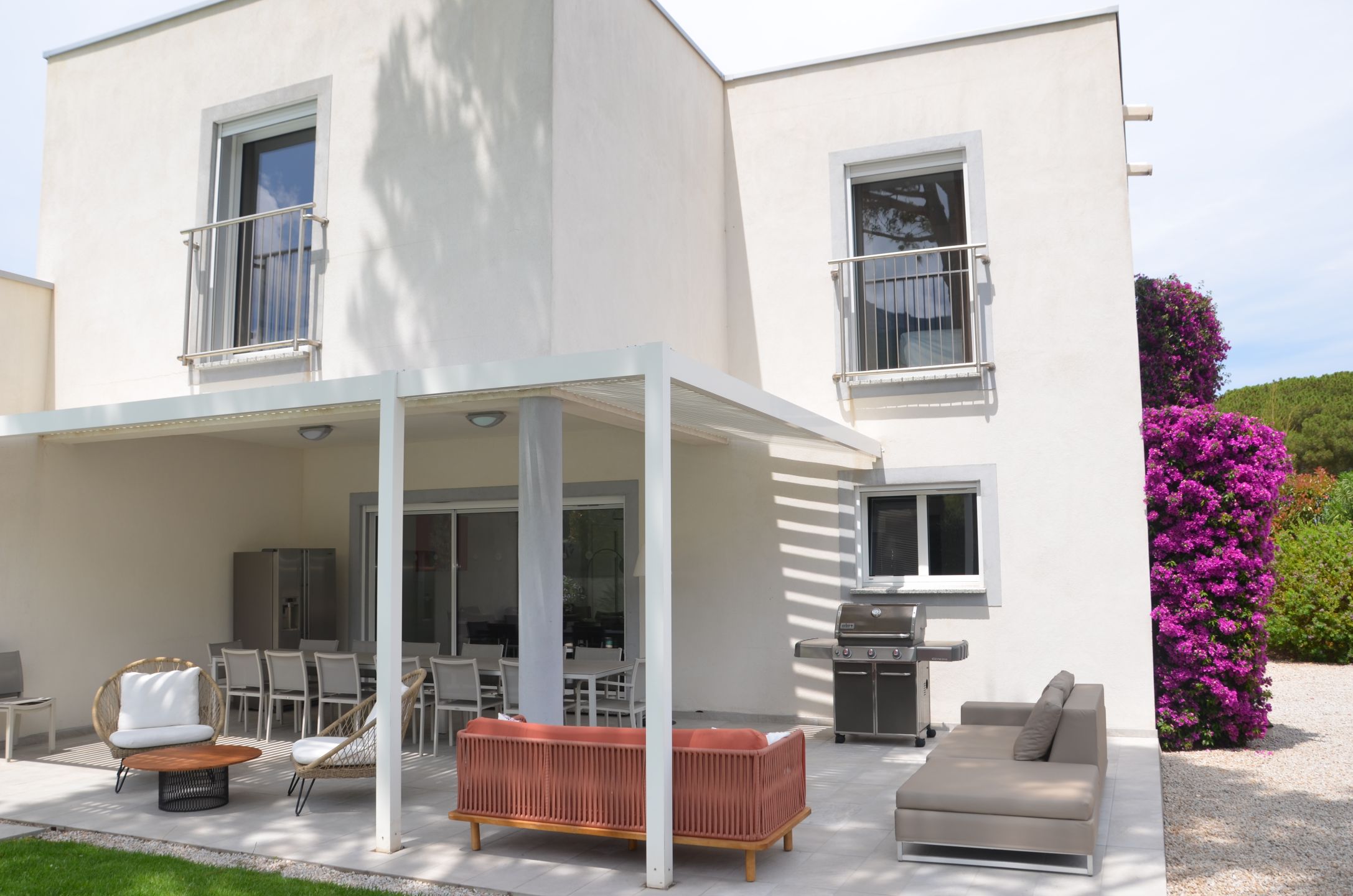 Schattige Außenterrasse mit Tisch, Liegestühlen und Sonnenschirm