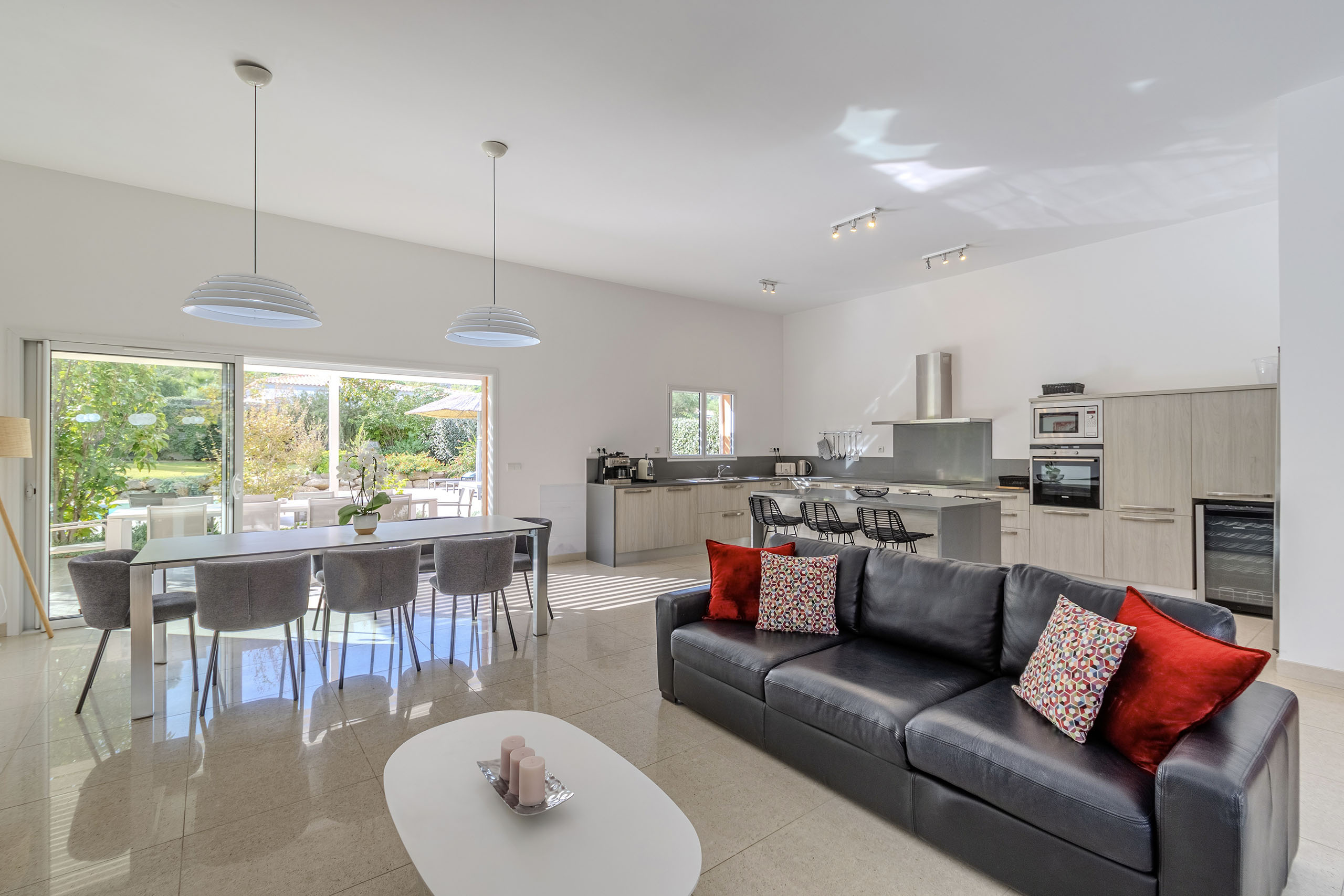 Living room of 65m² very bright with sofas. The dining area allows you to see you for a good meal around a table for 12 people. The open kitchen is fully equipped and functional. Washing machine, dryer.