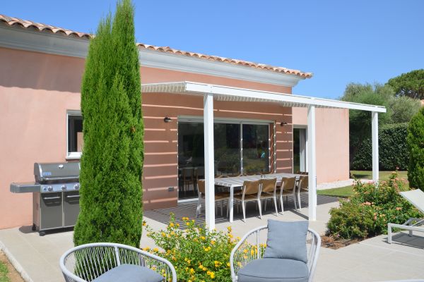 Terrasse extérieure ombragée avec table, transats et parasol